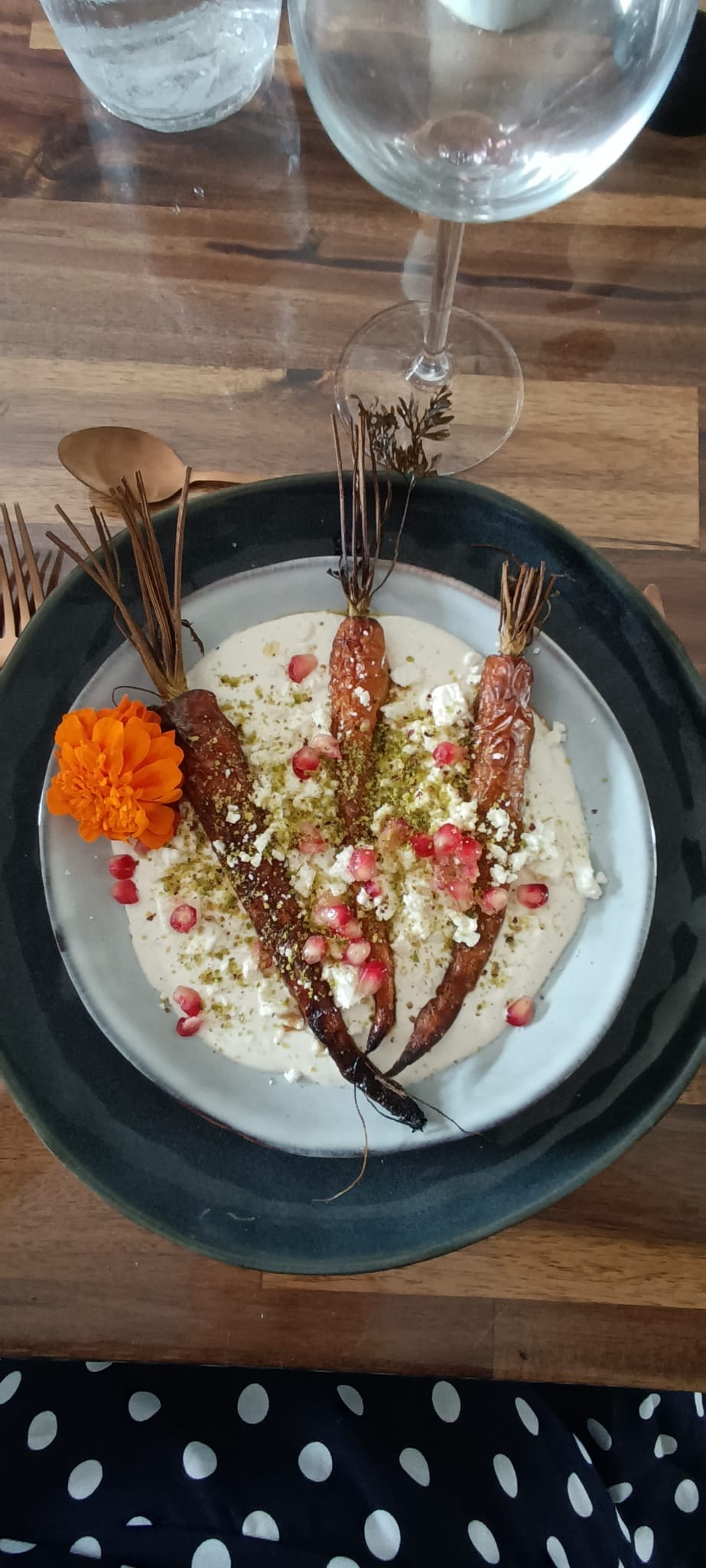 Enfin, parsemez de pistaches, grenade, du reste de fêta émietté, et d’herbe fraiche hachée.