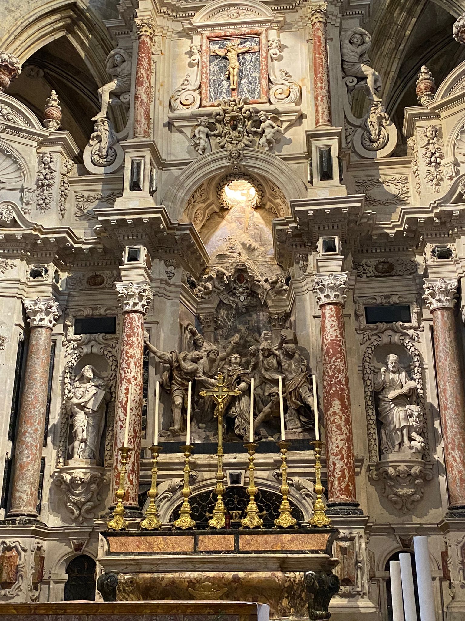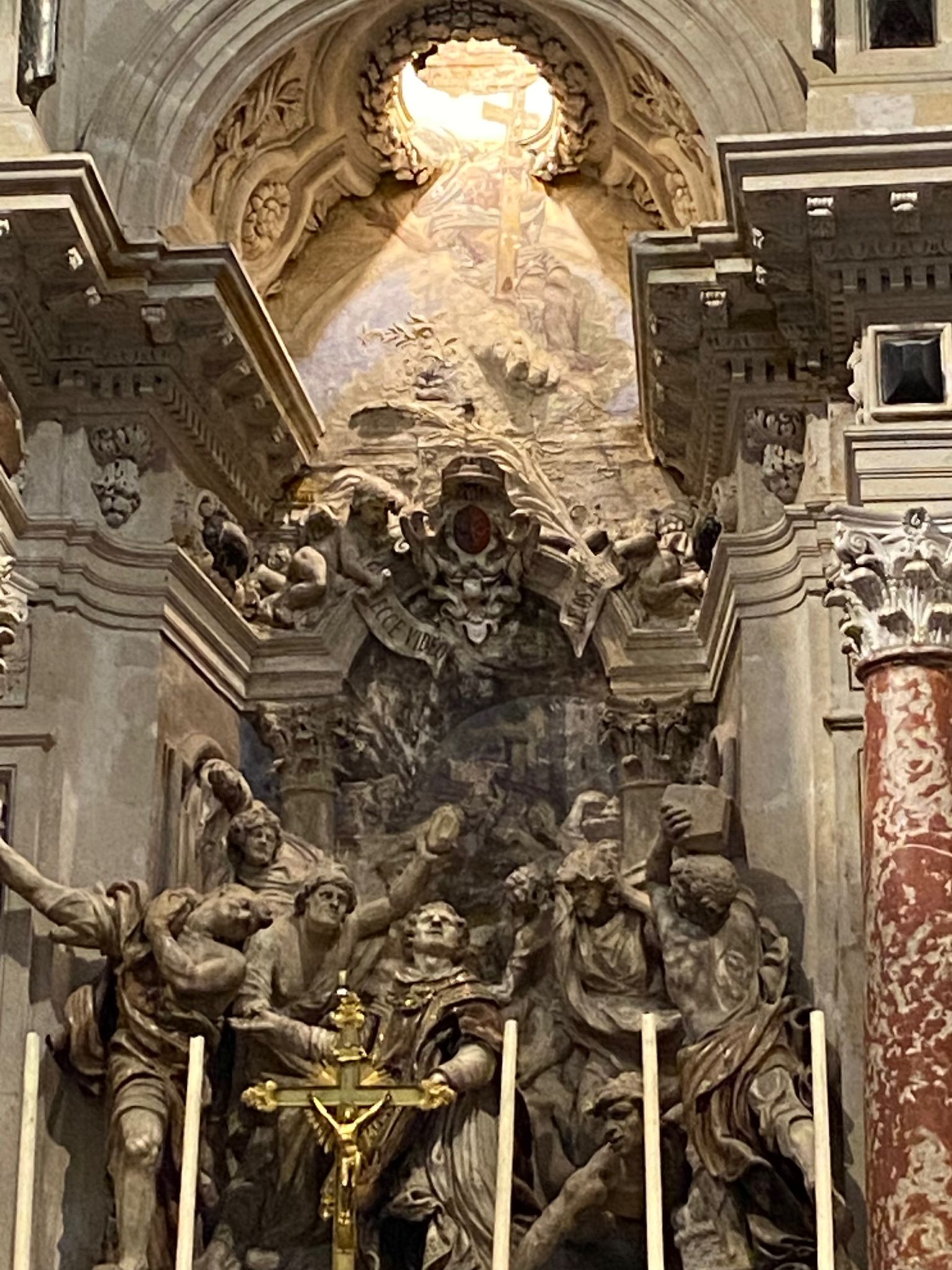 Nous avons commencé la visite à l’extérieur, sur le parvis coté préfecture, près de la chocolaterie, afin de pouvoir admirer la façade de cette cathédrale qui, au premier abord, pose question. Malgré la pluie, en l’observant, il est évident que l’édifice est un témoin immense de l’histoire du quartier.